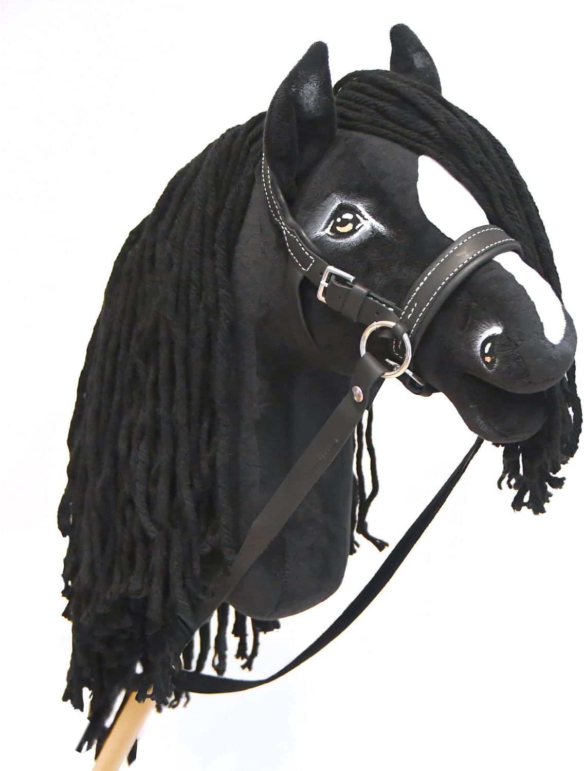 Hobby horse Frison réaliste avec longue crinière coiffable, parfait pour vivre des aventures élégantes et majestueuses.